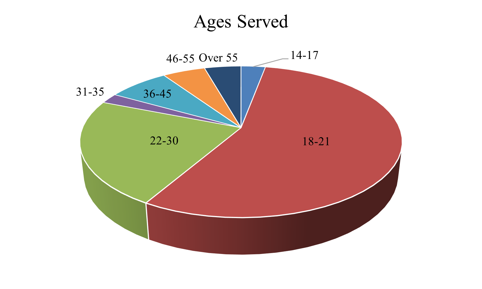 During FY23, the EDC served 66% of individuals between the ages of 18-21 years, 18% of individuals between the ages of 22-30 years, 6% of individuals between the ages of 46-55years, 4% of individuals between the ages of 36-45 years, 4% of individuals between the ages of 14-17 years, and 2% of individuals between the ages of 31-35 years.The EDC served 83.1% of individuals that identified as Caucasian, 11.3% of individuals that identified as African American, 4.2% of individuals that identified as Hispanic, and 1.4% of individuals that identified as ‘other’ during FY23.During FY23, the EDC served 62.7% of individuals that identified as Male and 37.3% of individuals that identified as Female. No individuals served indicated that they identified as transgender, cisgender, or gender-non-conforming during FY23.During FY23, the EDC served 84.2% of individuals that completed their programming at EDC successfully, 5% of individuals were hospitalized following discharge, 2% of individuals received medical/psych intervention following discharge. Approximately 7.9% of individuals prematurely dropped out of EDC programming during the FY23.Primary diagnoses of individuals served are shown in the chart. During FY23, the EDC served 32.4% of individuals diagnosed with Autism Spectrum Disorder, 22.5% of individuals diagnosed with a Learning Disability, 9.9% of individuals diagnosed with a Developmental Disability other than ASD and ADHD, 9.1% of individuals diagnosed with a Psychiatric/Mental Illness, 8.5% of individuals diagnosed with Attention Deficit-Hyperactivity Disorder, 7% of individuals diagnosed with an Orthopedic condition, 3.5% of individuals diagnosed with a Hearing Impairment, 2.1% of individuals diagnosed with a Visual Impairment, 1.4% of individuals diagnosed with a Traumatic Brain Injury, and 1% of individuals diagnosed with Epilepsy.